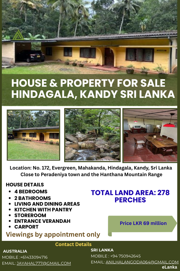 No172, Evergreen, Mahakanda, Hindagala, Kandy Sri Lanka house and property is situated close to the Peradeniya town located in a peaceful residential and tourist accommodation zone, in close proximity to the Hanthana Mountain Range, a region renowned for its scenic beauty and temperate climate.